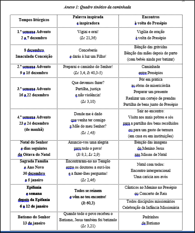 A ideia dominante desta caminhada é viver o Natal como festa do encontro e anúncio de alegria para todos, na certeza de que “a alegria do Evangelho enche o coração e a vida inteira daqueles que se encontram com Jesus” (EG 1). O nosso desafio é criar uma cultura do encontro, que alente cada pessoa e cada grupo a partilhar a riqueza das suas tradições e experiências, a abater muros e a construir pontes. Vão neste sentido as propostas que envolvem, além dos cristãos, todas as pessoas de boa vontade. Queremos dar à celebração do Natal deste ano, à sua preparação e vivência, esta perspetiva ampla do “encontro”, porque o Natal é, por excelência, a festa do encontro com Jesus, que inspira, mobiliza e motiva tantos outros encontros pessoais, familiares, eclesiais, sociais e culturais.